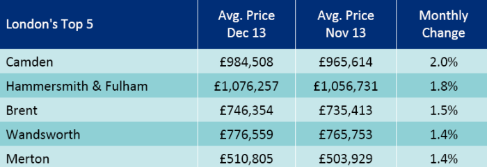 See the trend of changes in the prices of residential property in London in terms of areas of London for a year in the report of the British edition of the Rightmove compiled by the end of 2013: