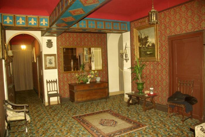 Gothic style living room with beautiful carved wooden ornaments, a private lounge-bar with dance floor. All Gothic style wrought-iron ornaments, sculptures, mosaic, and numerous fireplaces. The kitchen is decorated in the same style. The castle includes 25 rooms.