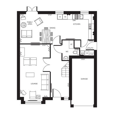 The house includes an integral garage, four bathrooms, four bedrooms , and a spacious kitchen combined with dining room and living room on the ground floor.